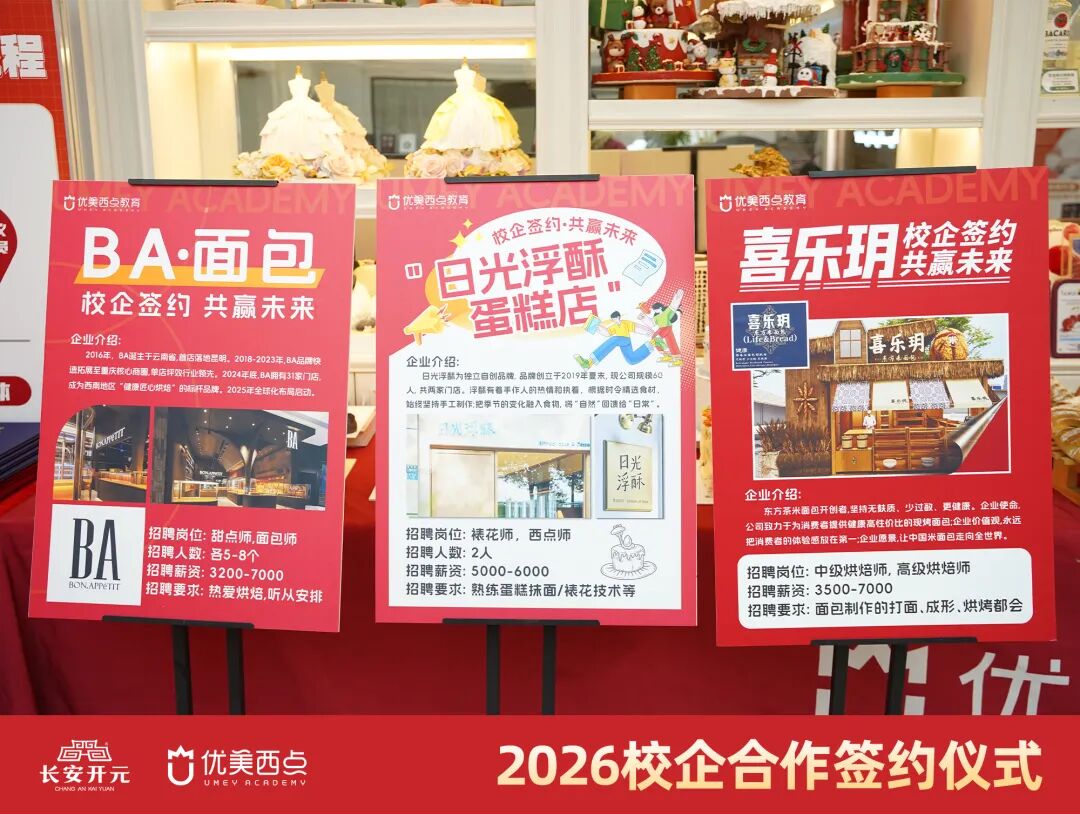 三大烘焙品牌均是深耕市场、口碑卓著的优质企业,拥有完善的培训体系、清晰的晋升通道与优质的就业平台,将为优美西点学子提供裱花师、面包师、技术研发、门店管理等多元发展岗位,助力学子实现职业梦想。