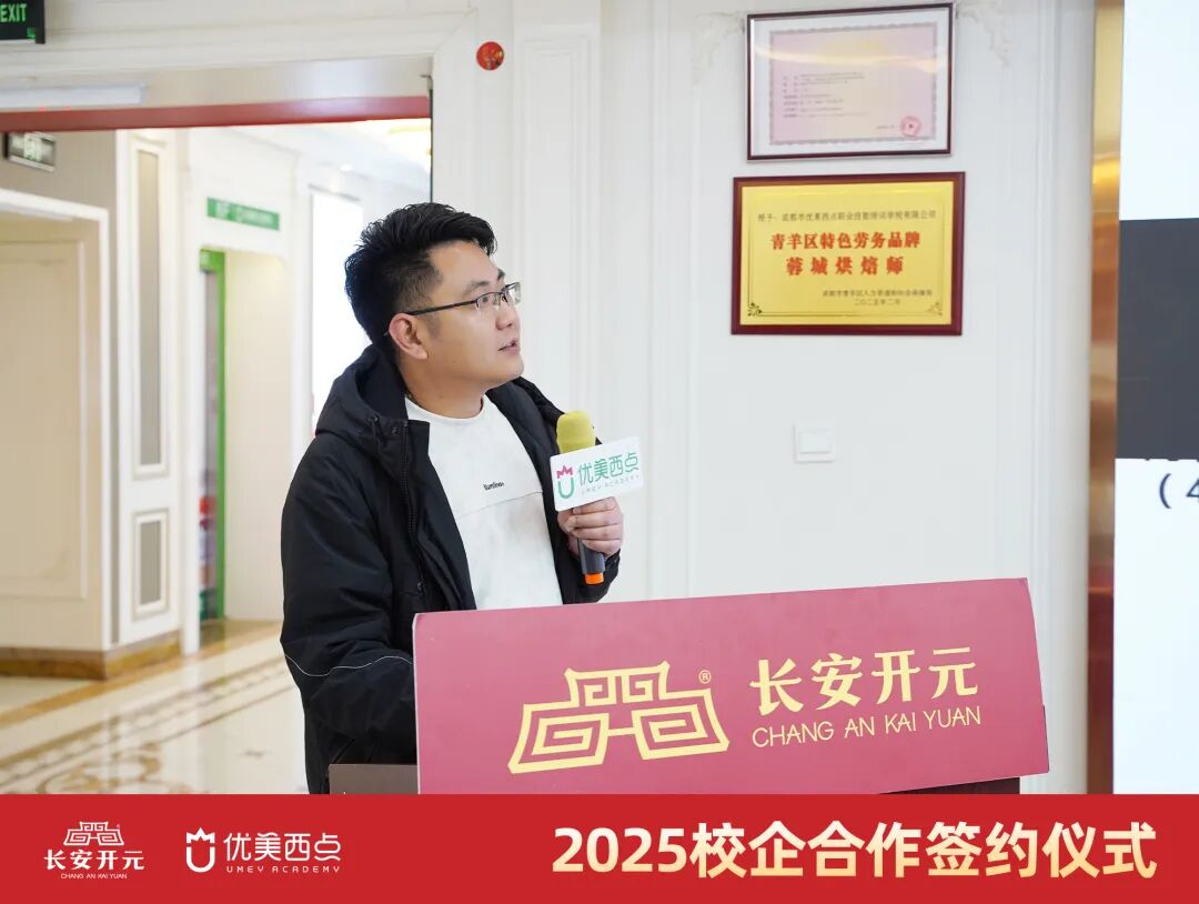 校企合作是职业教育的灵魂,产教融合是技能成才的基石。仪式伊始,成都优美西点教务主管杨主管上台致辞,字字句句饱含着对烘焙教育的初心、对学子成长的殷切期许,以及对合作企业的诚挚感谢。